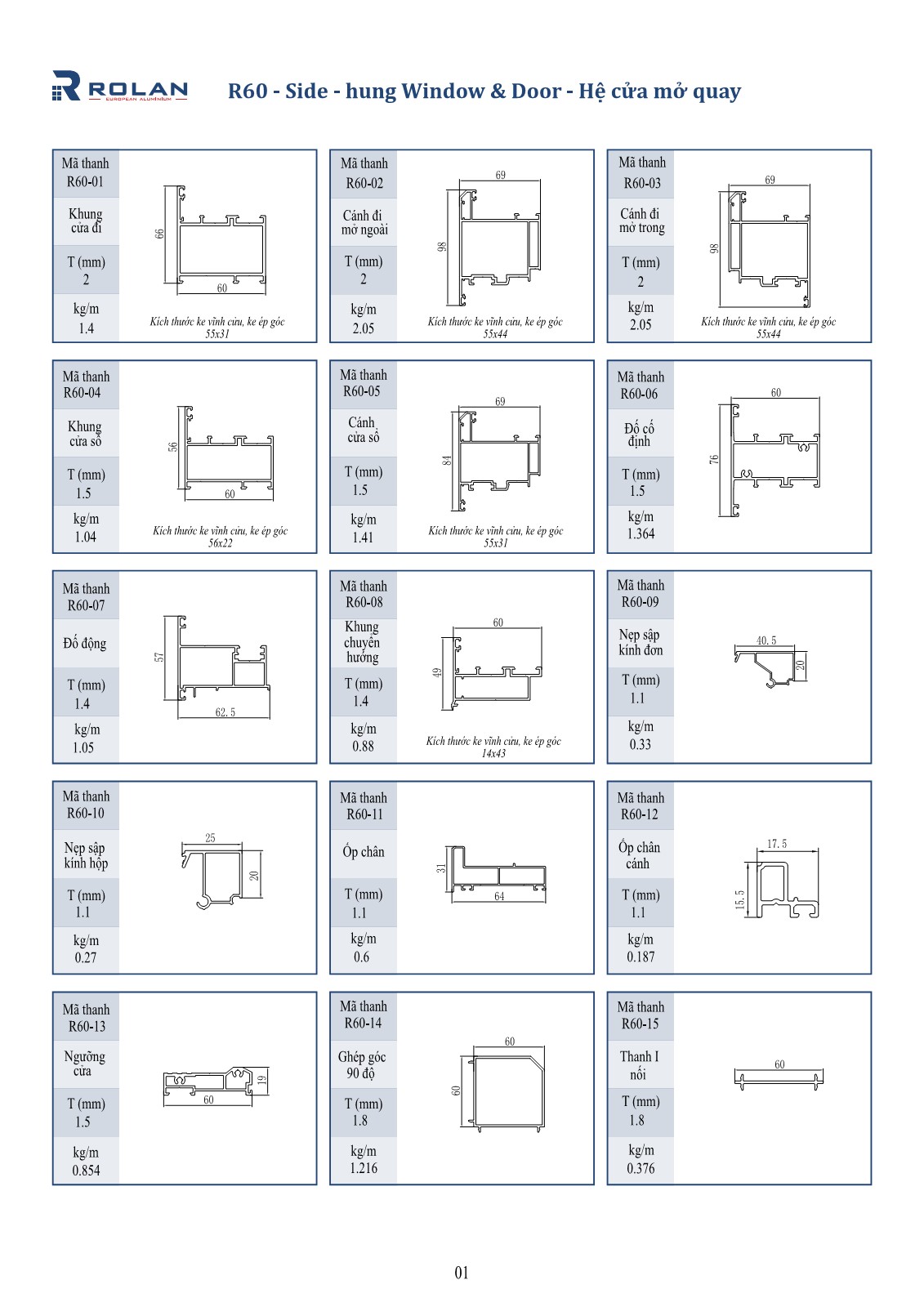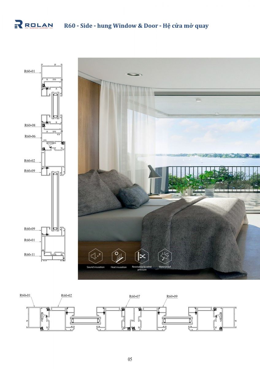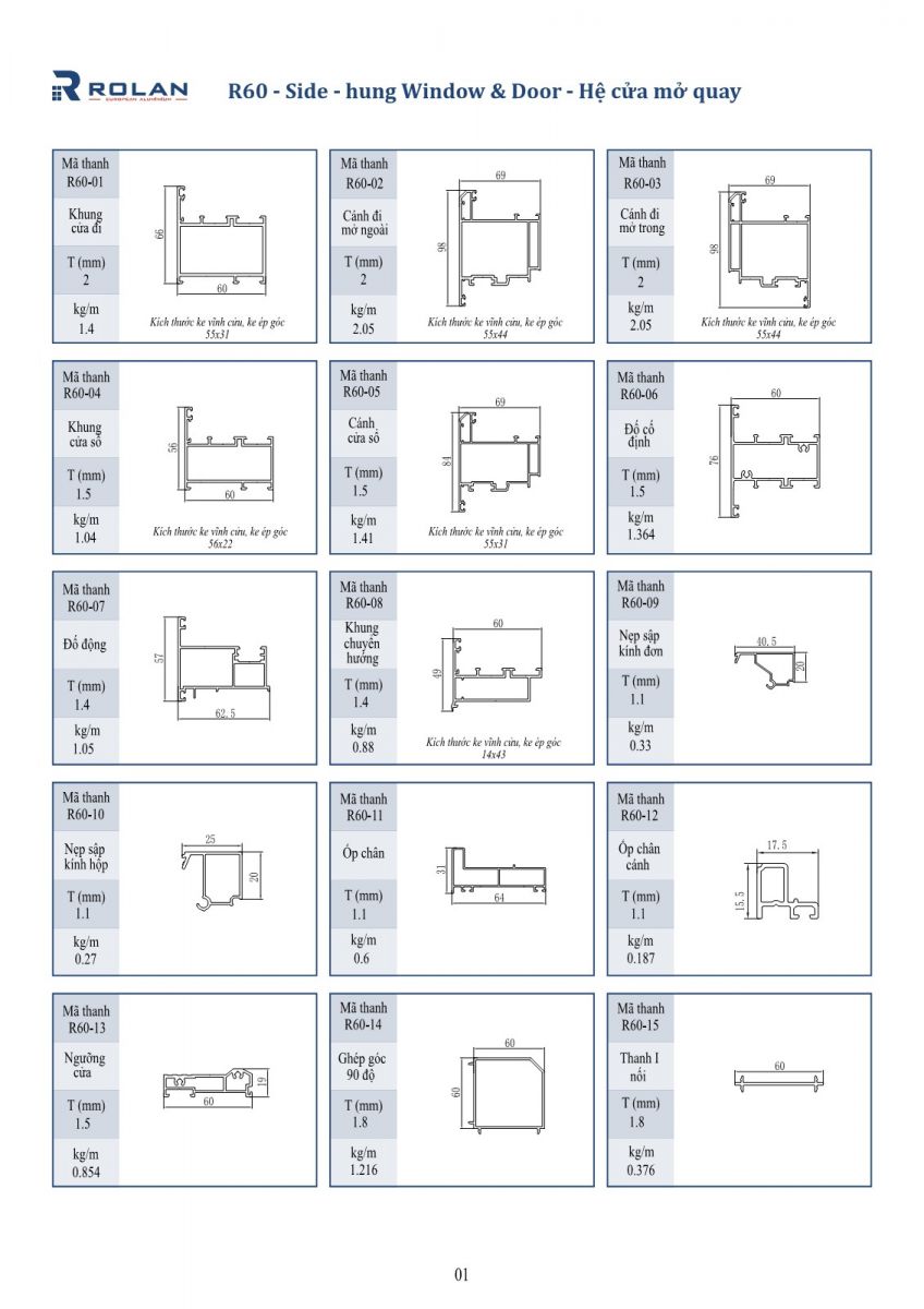 – R60 là hệ cửa đi, cửa sổ mở quay, được thiết kế rãnh C theo tiêu chuẩn Châu Âu, với độ dày cửa sổ là 1.4mm và cửa đi 2.0mm
